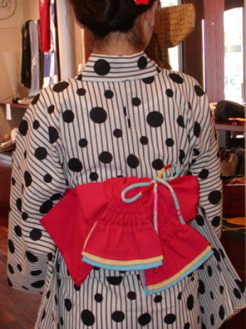赤い兵児帯に飾りひもを あしらい可愛く変わり結びで 決めました。 次回はどんな結び方に しましょう・・・・・・ 既成の結び帯ではこうは いきませんよ・・・・